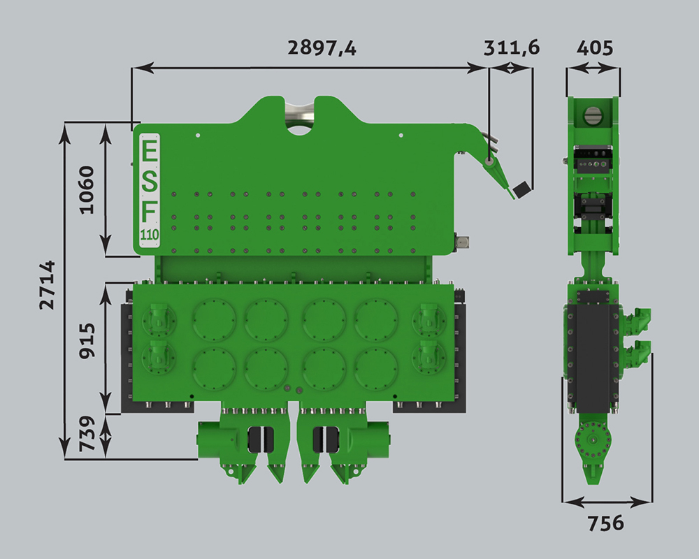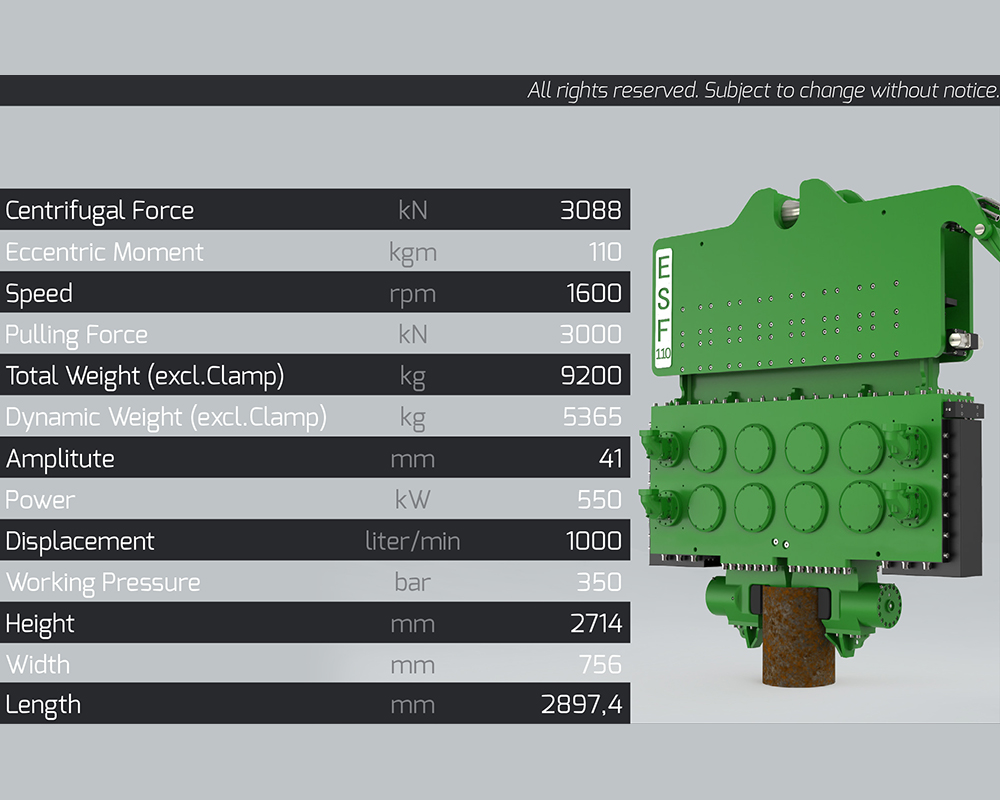 ESF 110 is Normal Frequency vibratory hammer with gear box cooling system as stan- dard. As it is Normal Frequency it is operated by PS1000 power pack. The FCM250 sheet pile clamp and 2xPCM150 pipe clamp can be mounted. This model is preferred to drive long sheet piles or steel tubes in seaport or bridge const. projects.