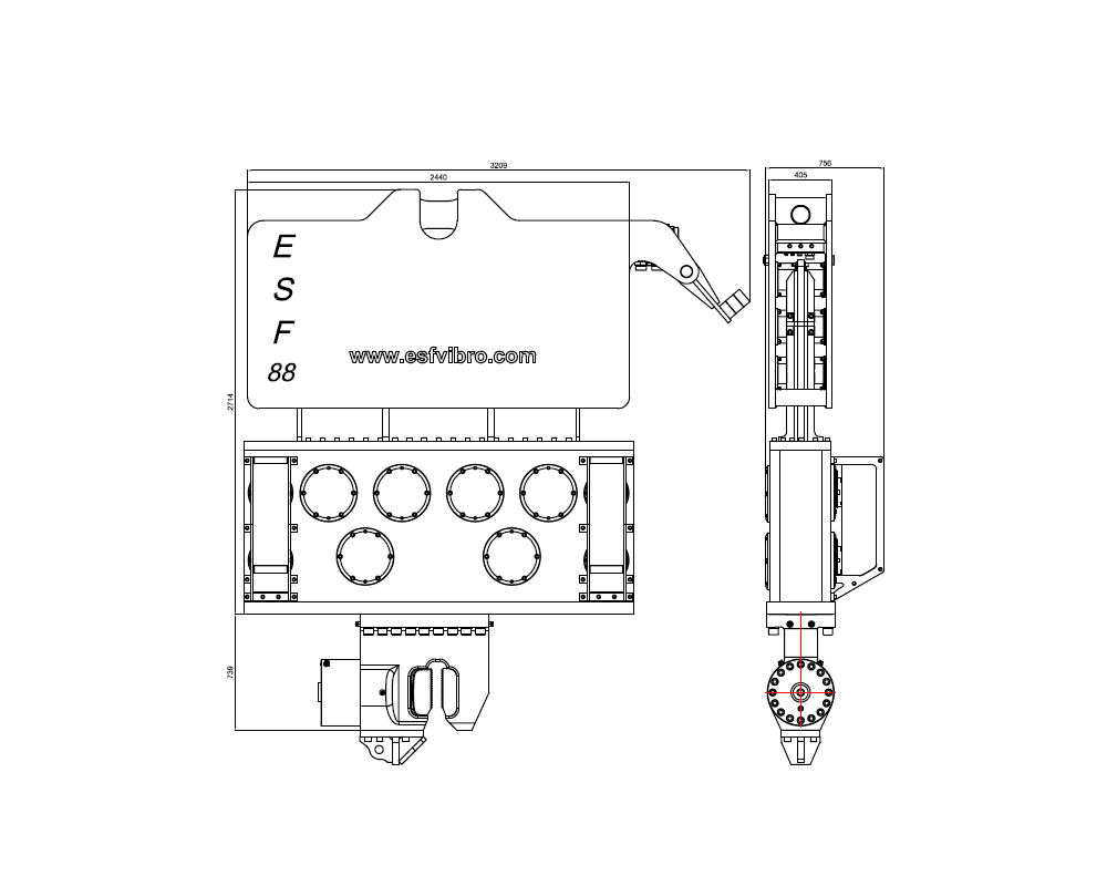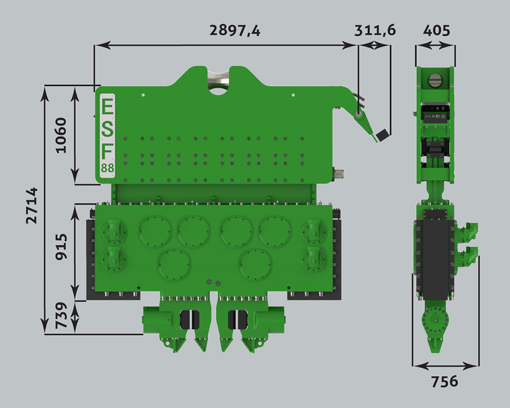 ESF 88 is Normal Frequency vibratory hammer with gear box cooling system as stan- dard. As it is Normal Frequency it is operated by PS800 power pack. The FCM200 sheet pile clamp and 2xPCM120 pipe clamp can be mounted. This model is preferred to drive long sheet piles or steel tubes in seaport or bridge const. projects.