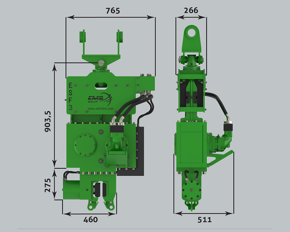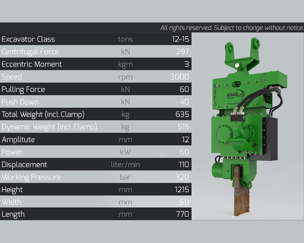 ESF3 model vibro hammer is a very unique and special for small size pile driving applications. This model is attached to 16 tons class excavators.